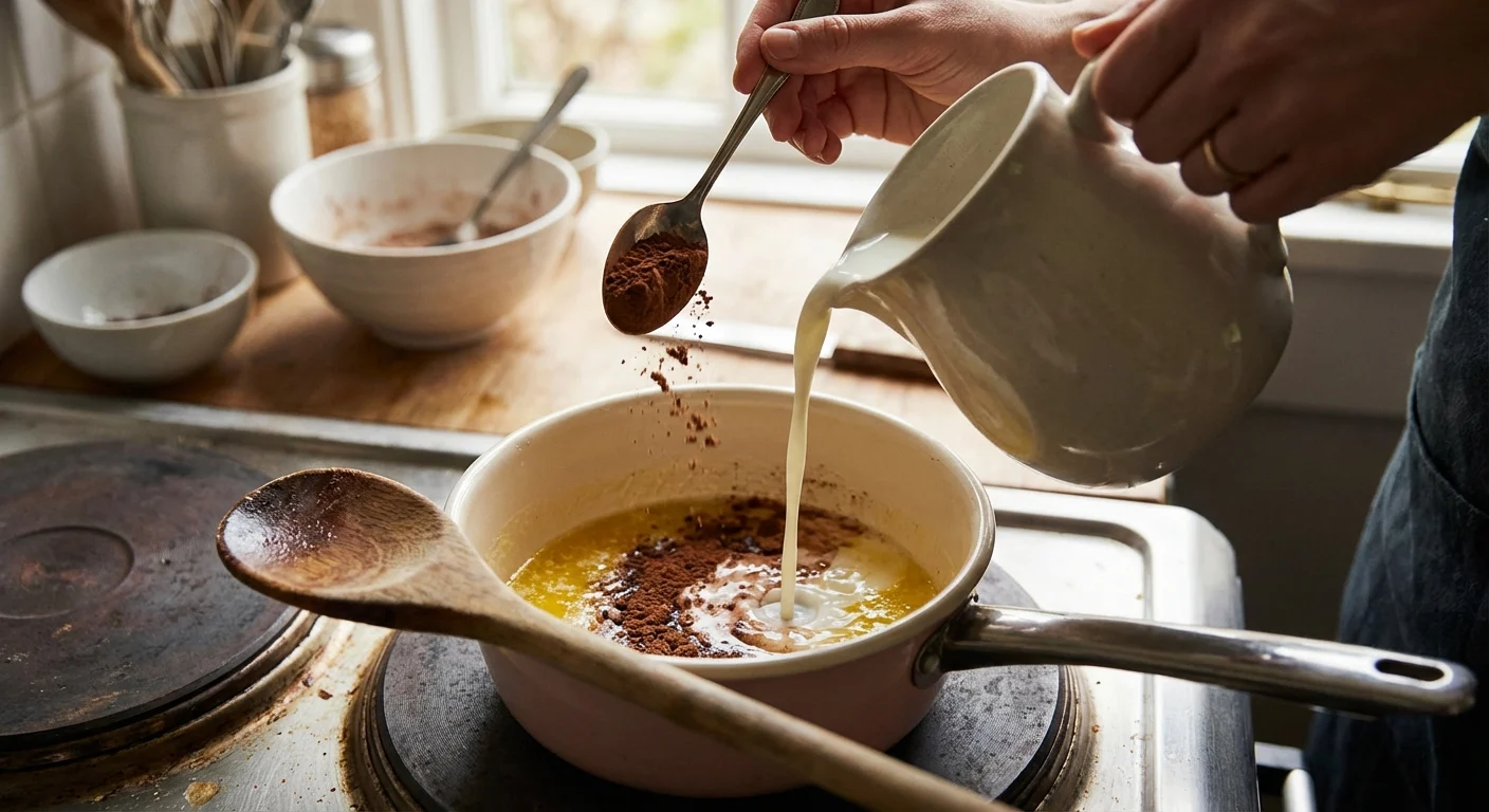 Tereyağını bir sos tenceresinde eritin. Üzerine süt, toz şeker ve kakaoyu ekleyip şeker eriyene kadar tel çırpıcı ile karıştırın. Kaynamasına gerek yok, sadece ısınması yeterli.