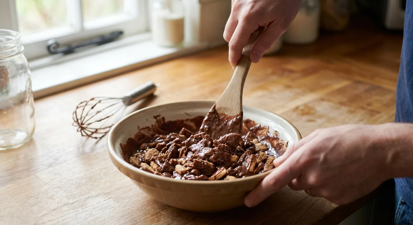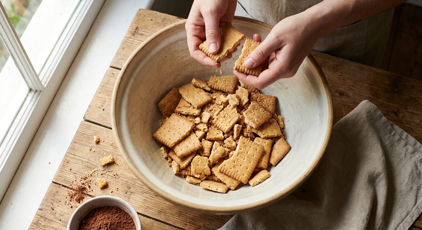Bisküvileri bir karıştırma kabına, çok ufalamadan, elle iri parçalar halinde kırın.