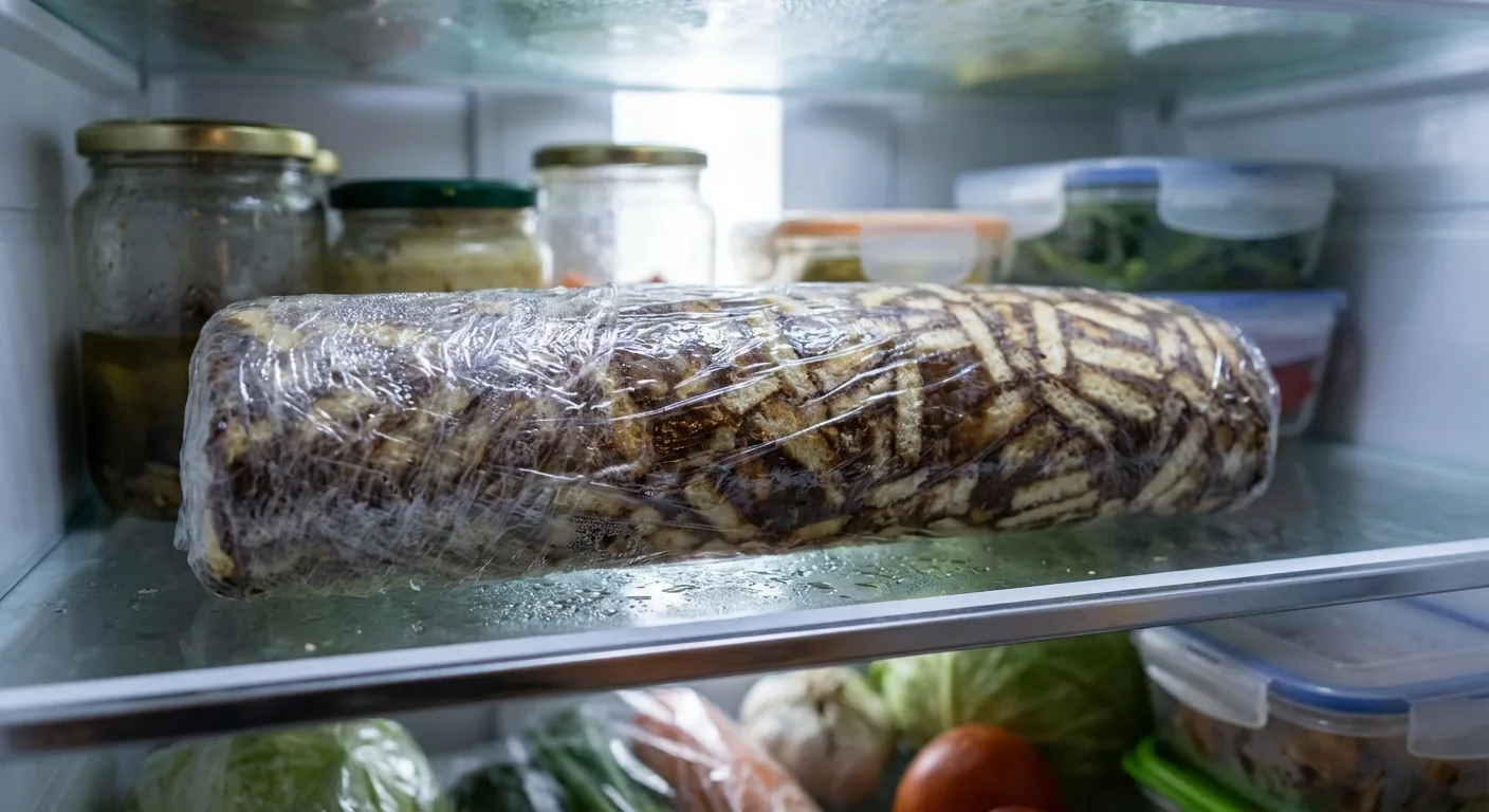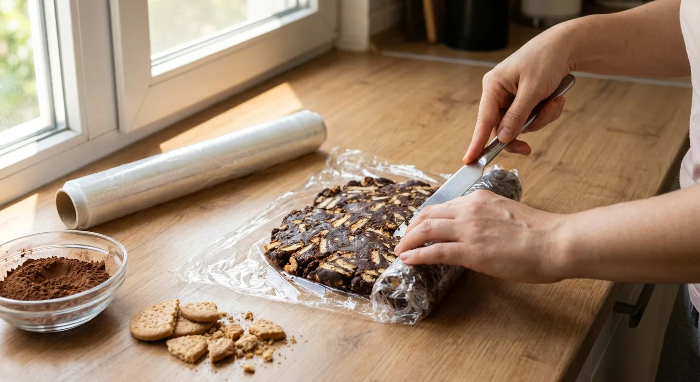 Karışımı streç film serilmiş bir tezgaha dökün ve elinizle veya spatula ile rulo veya piramit şekli verin. Streç film ile sıkıca sarın.