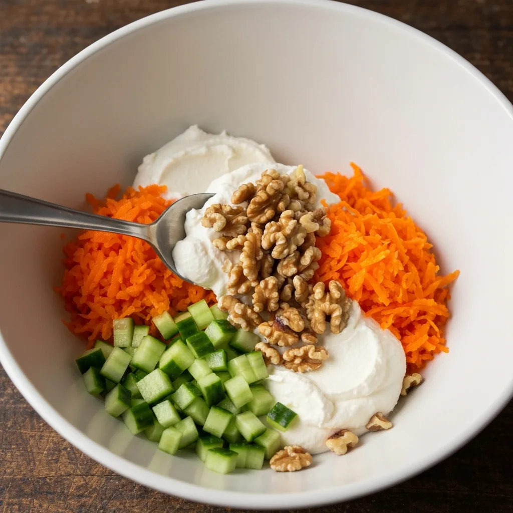 İç harcı hazırlamak için labne peyniri, rendelenmiş havuç, doğranmış salatalık ve ceviz içini bir kapta karıştırın.
