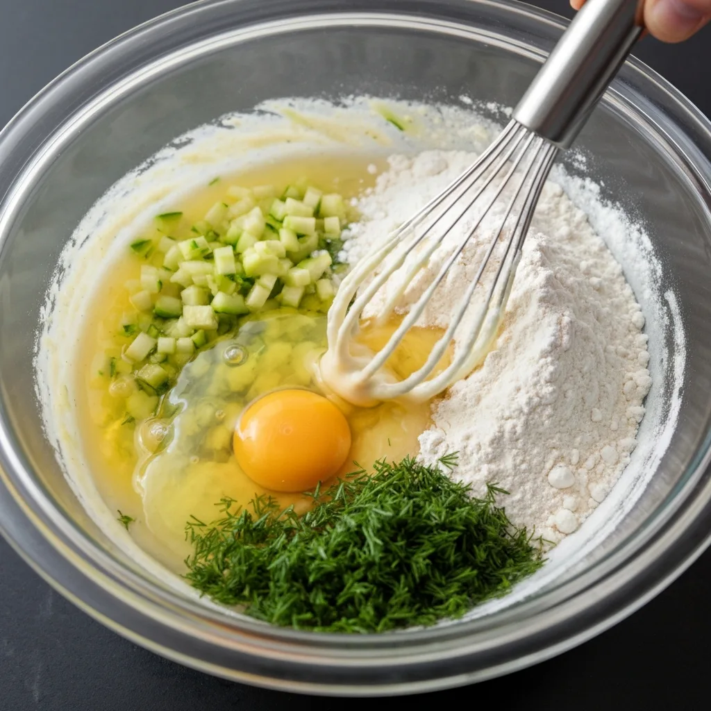 Suyu sıkılmış kabakları geniş bir kaba alın. Üzerine yumurta, un, ince kıyılmış dereotu ve nane, tuz ve karabiberi ekleyip iyice karıştırın. Krep hamurundan biraz daha yoğun bir kıvam elde etmelisiniz.