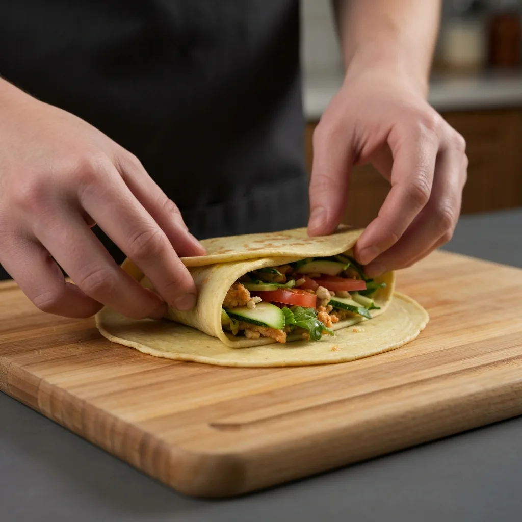 Pişirdiğiniz mücver kreplerinin soğumasını bekleyin. Üzerlerine iç harçtan bolca sürün, isteğe bağlı olarak roka yaprakları yerleştirin ve sıkı bir rulo şeklinde sarın.