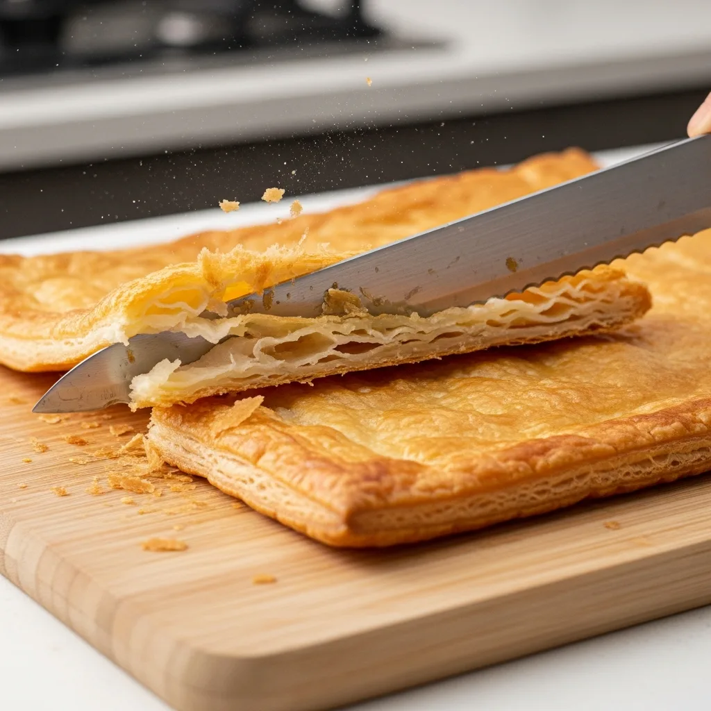Pişmiş ve soğumuş milföy hamurlarını dikkatlice ortadan ikiye ayırın.