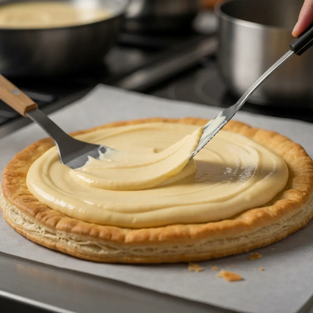 Milföyün taban katmanına soğumuş muhallebiden bolca sürün.