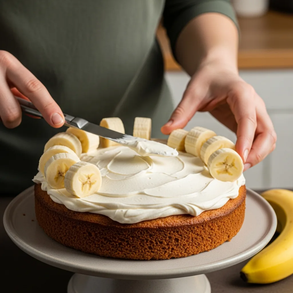 Soğuyan keki açın. İçine hazırladığınız kremayı yayın ve kenar kısmına muzları bütün olarak yerleştirin.
