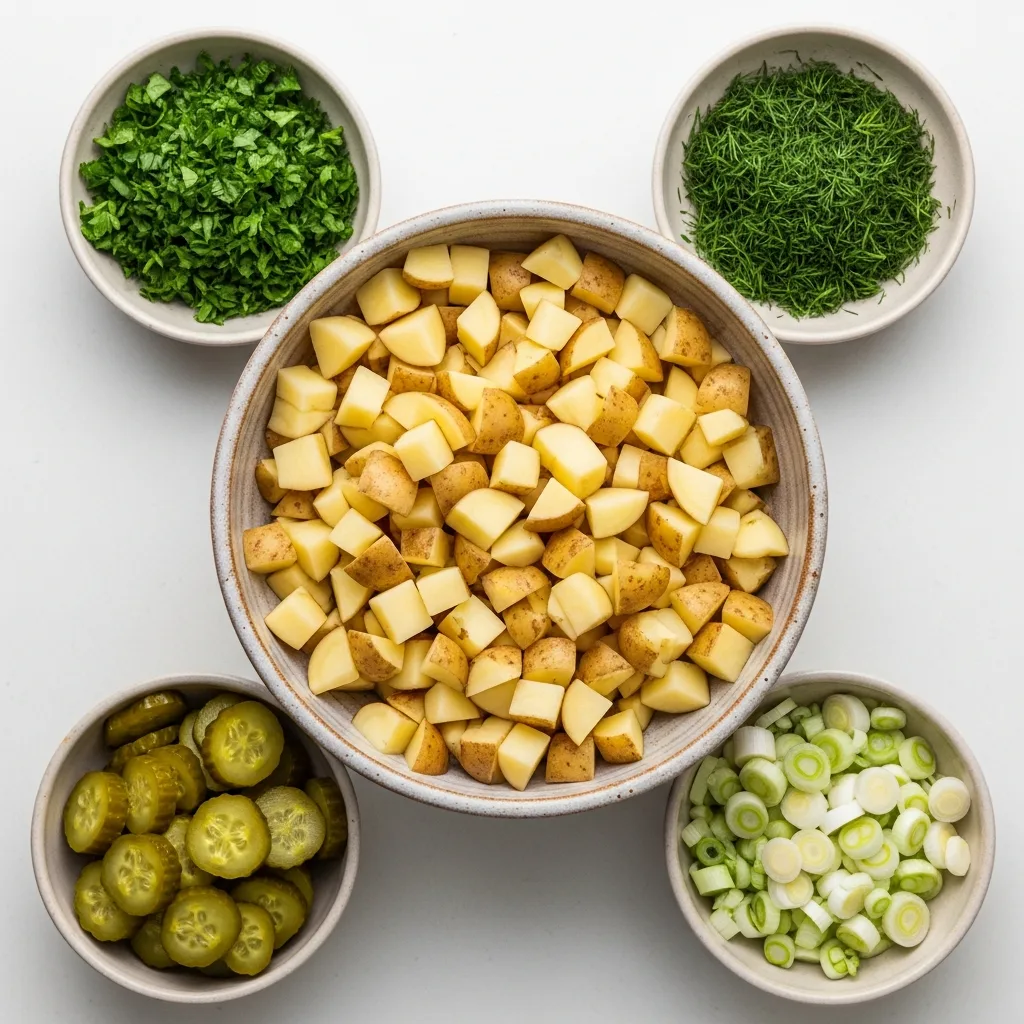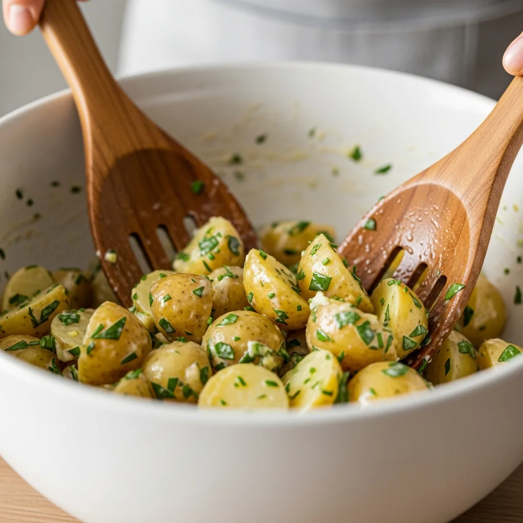 Hazırladığınız sosu salatanın üzerine gezdirin ve patatesleri ezmeden, nazikçe karıştırın.
