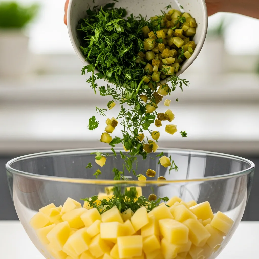 Doğradığınız tüm yeşillikleri ve turşuyu patateslerin üzerine ekleyin.