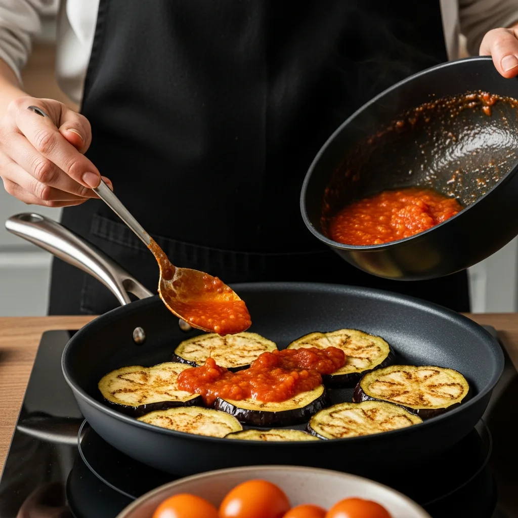 Patlıcanları alacalı soyup yuvarlak veya uzunlamasına dilimleyin. Tuzlu suda 20 dakika bekleterek acısını alın, kurulayın ve kızgın yağda arkalı önlü kızartıp fırın tepsisine dizin.