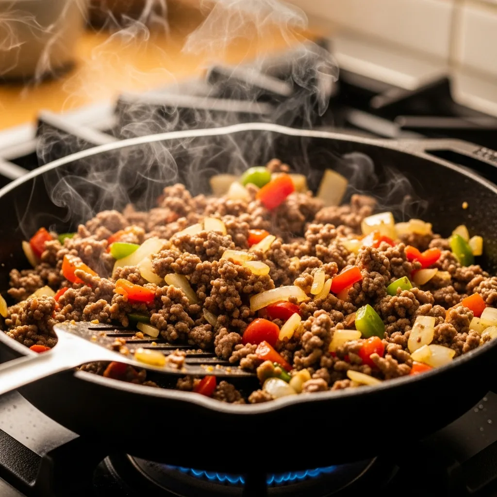 Ayrı bir tavada yemeklik doğranmış soğanları ve biberleri kavurun. Kıymayı ekleyip rengi dönene kadar kavurmaya devam edin.