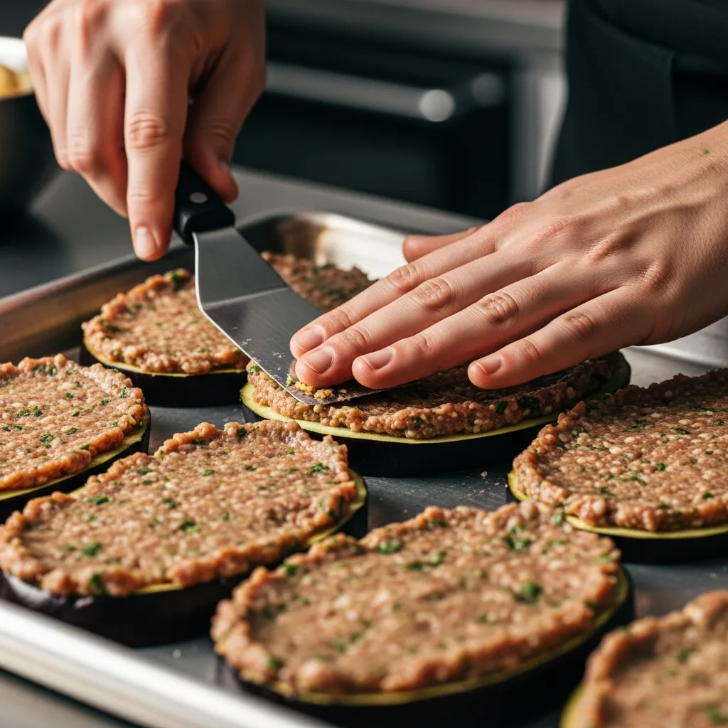 Kıymalı harcı, tepsiye dizdiğiniz patlıcanların üzerine eşit şekilde yayın.