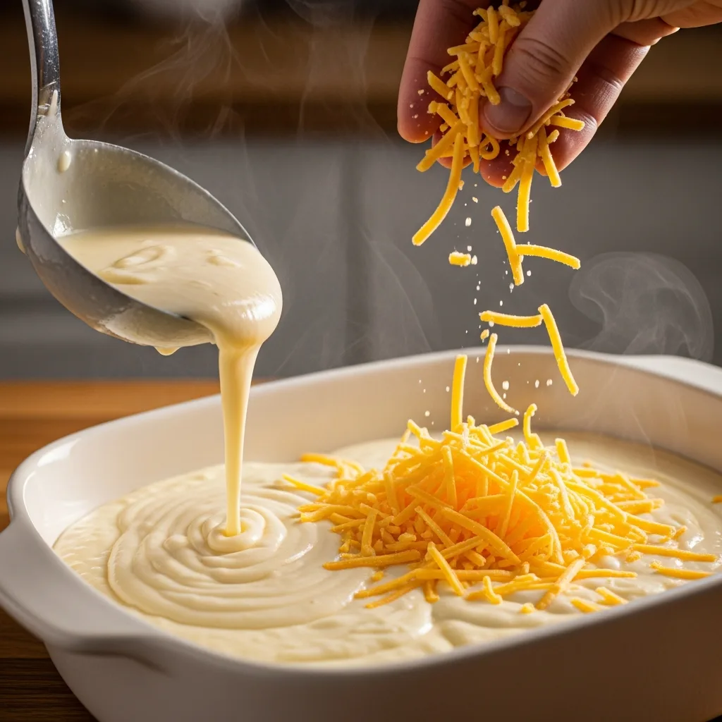 Hazırladığınız beşamel sosu yemeğin üzerine dökün ve en üste rendelenmiş kaşar peynirini serpin.