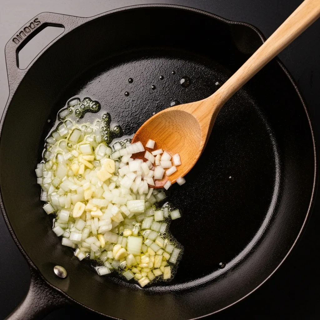Bir tavada zeytinyağını ısıtın. Yemeklik doğradığınız soğanları ve ezilmiş sarımsakları pembeleşinceye kadar kavurun.
