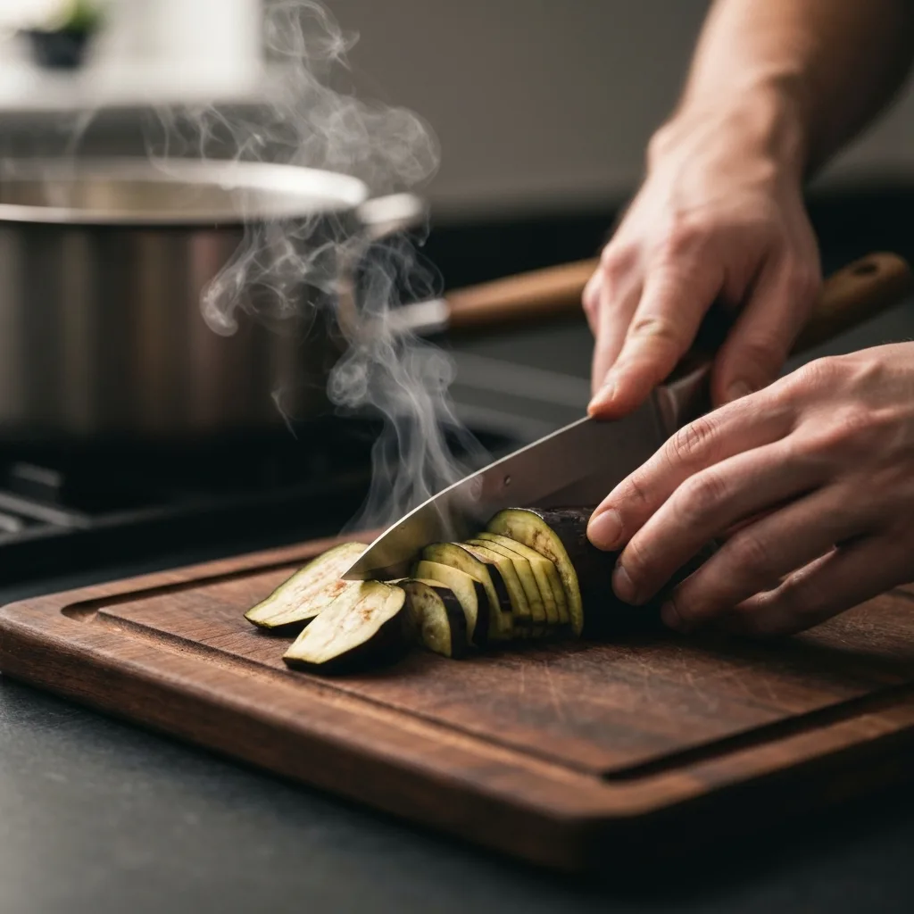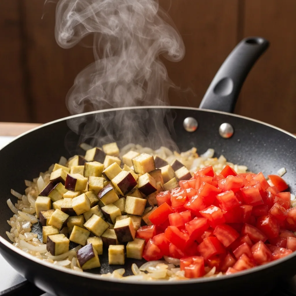 Rendelediğiniz domatesleri tavaya ekleyin ve suyunu çekene kadar pişirin. Ardından közlenmiş patlıcanları, tuzu ve karabiberi ilave edip 5 dakika daha karıştırarak pişirin. Ocaktan alıp ince kıyılmış maydanozu ekleyin ve soğumaya bırakın.