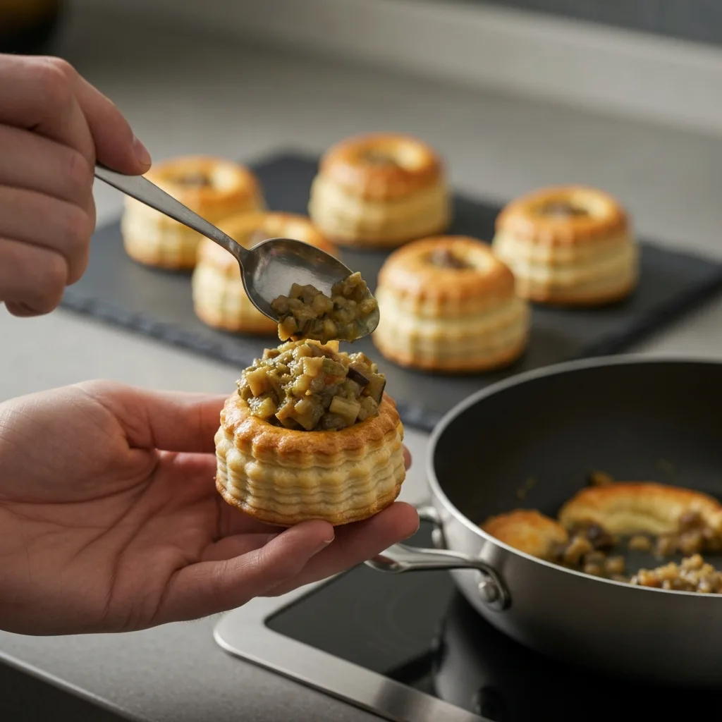 Fırından çıkan sıcak volovanların ortasındaki kabarmış kısma bir kaşık yardımıyla hafifçe bastırarak çukur açın. İçlerini hazırladığınız patlıcanlı harç ile doldurarak servis yapın.