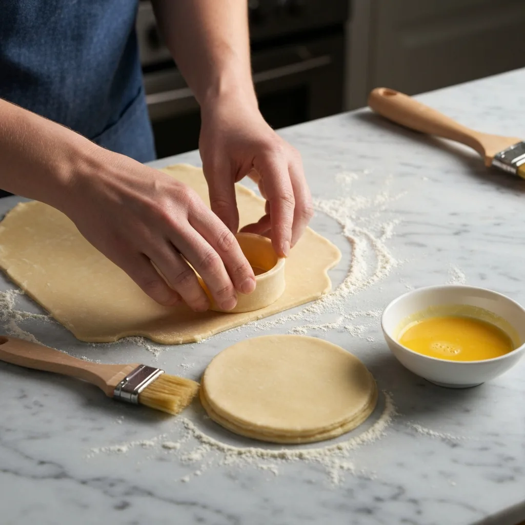 Milföy hamurlarını tezgaha alın. Bir hamurun üzerine yuvarlak bir kalıp veya bardakla bastırarak daire çıkarın. Diğer hamurdan da aynı büyüklükte bir daire kesin ve ortasını daha küçük bir kalıpla keserek halka oluşturun.