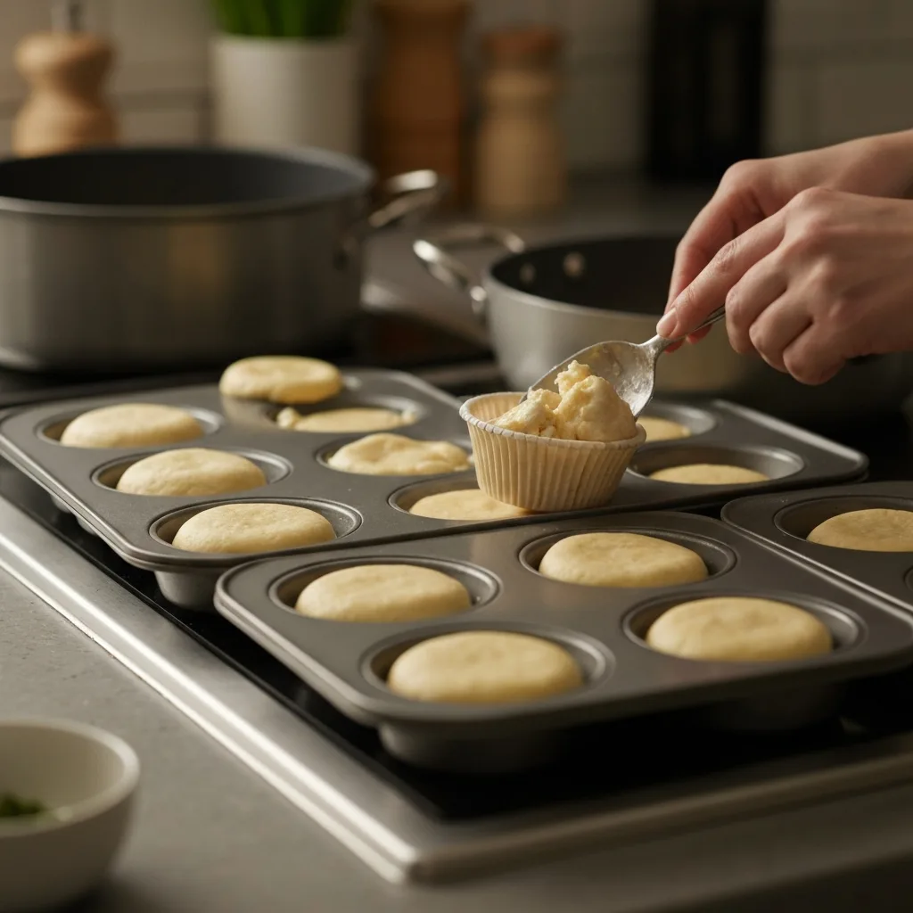 Milföy hamurunu muffin kalıplarının içine yerleştirin ve hazırladığınız muhallebi ile doldurun.