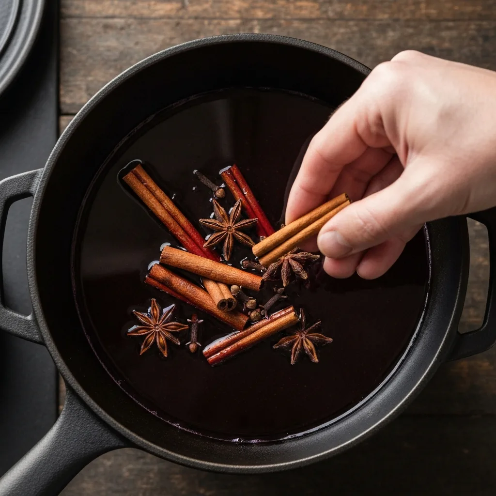 Armutların sığabileceği derin bir tencereye kırmızı şarap, toz şeker, çubuk tarçın, yıldız anason, karanfil, vanilya çubuğu ve portakal kabuğu şeritlerini koyun.