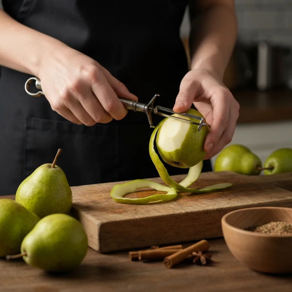 Armutların kabuklarını, saplarını yerinde bırakarak dikkatlice soyun. Düz durabilmeleri için alt kısımlarından çok ince bir dilim kesin.