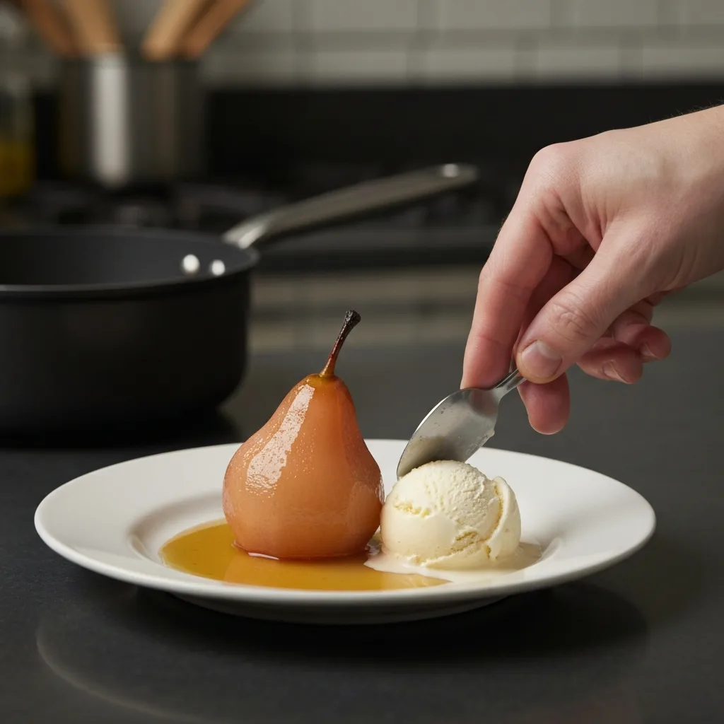Hazırladığınız yoğun şurubu armutların üzerine gezdirin. Ilık veya soğuk olarak, vanilyalı dondurma veya kaymak eşliğinde servis yapın.