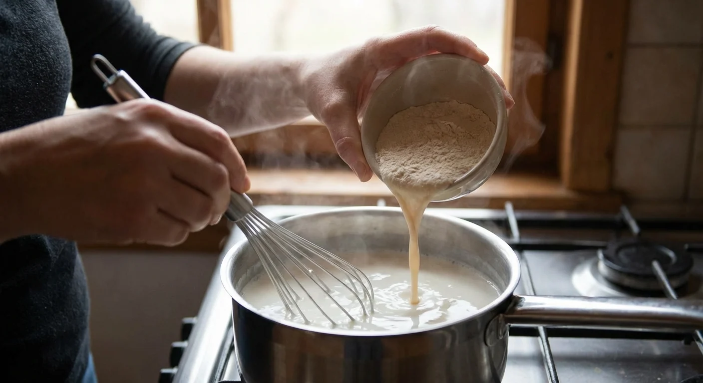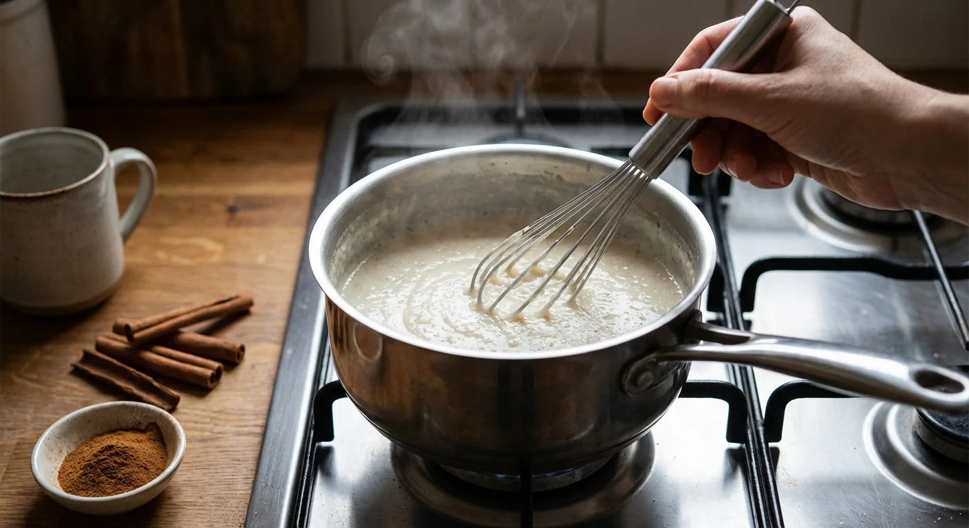 Süt ısınınca, bir yandan çırpıcı ile sürekli karıştırırken diğer yandan şekerli salep karışımını yavaşça süte ekleyin.