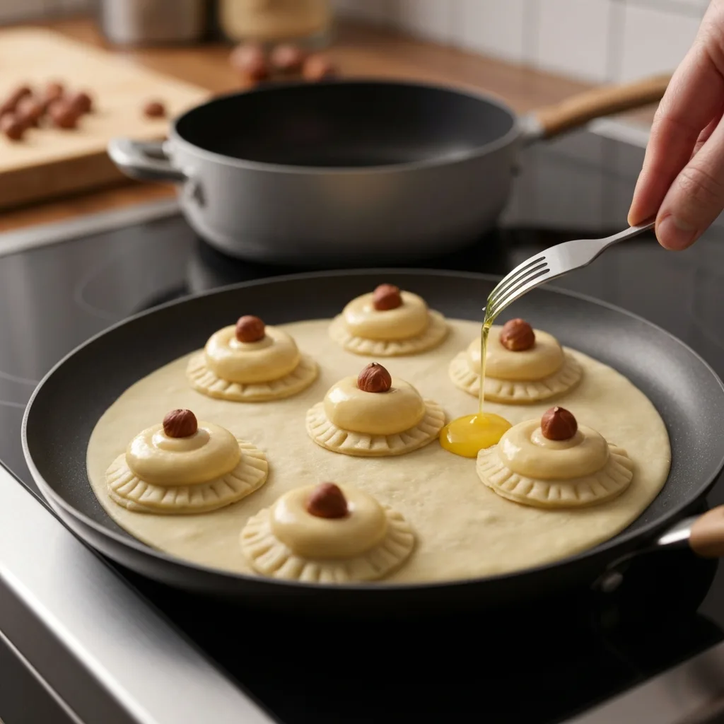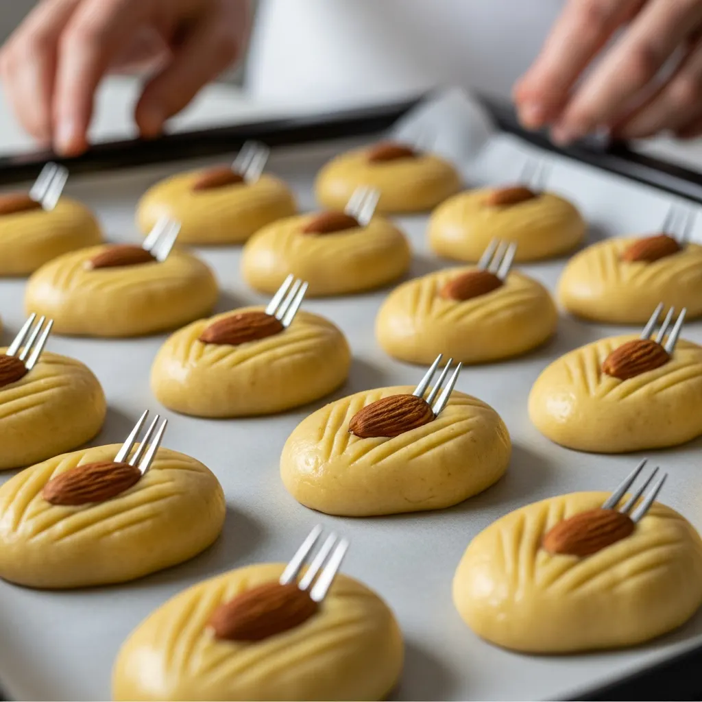 Üzerlerine yumurta sarısı sürün, birer adet badem veya fındık batırın ve çatalla hafifçe çizin.
