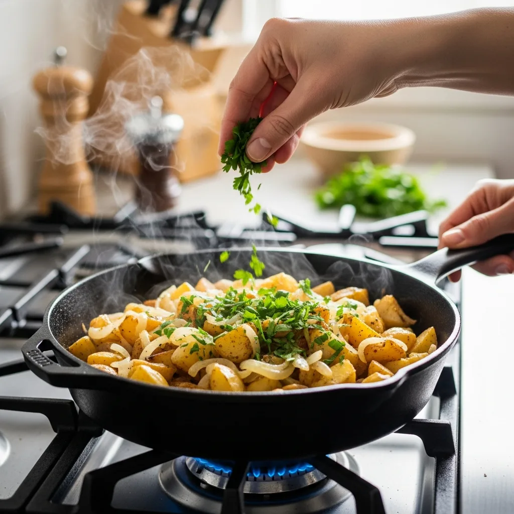 Haşlanmış ve süzülmüş patatesleri, tuzu ve baharatları tavaya ekleyin. Patatesleri ezmemeye özen göstererek nazikçe karıştırın ve 5-7 dakika kadar daha kavurun.