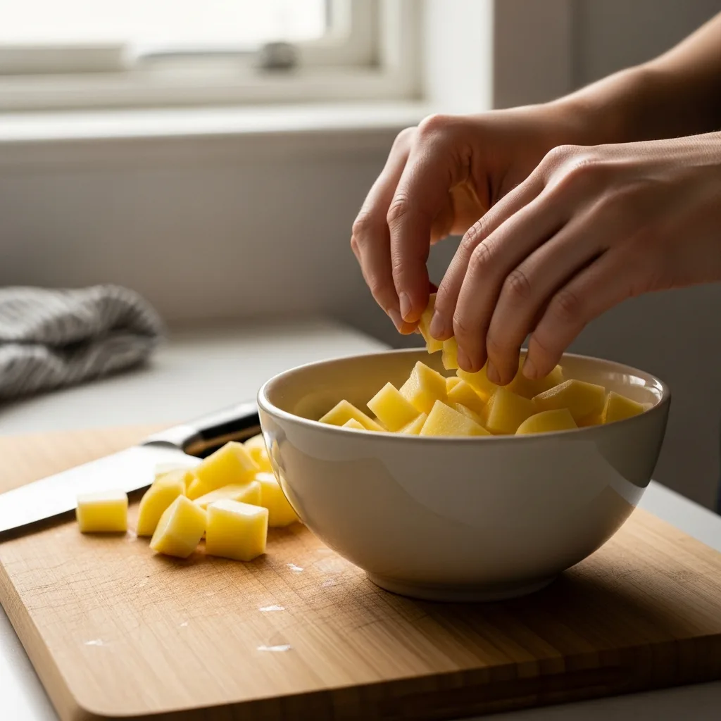 Patatesleri soyun, küp küp doğrayın ve çok dağılmayacak şekilde, hafif diri kalacak kıvamda haşlayın. Haşladıktan sonra suyunu süzün.