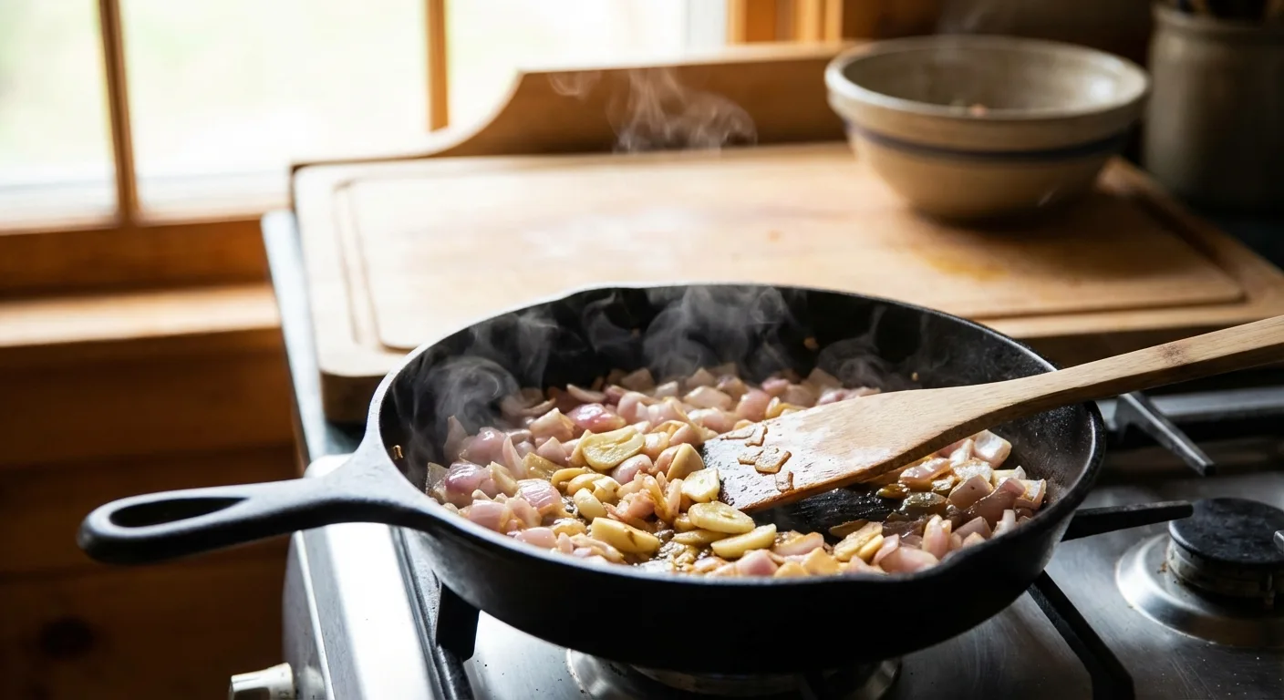 Aynı tavaya gerekirse biraz daha yağ ekleyip soğanları pembeleşinceye kadar kavurun. Sarımsakları ekleyip 1 dakika daha kavurun.