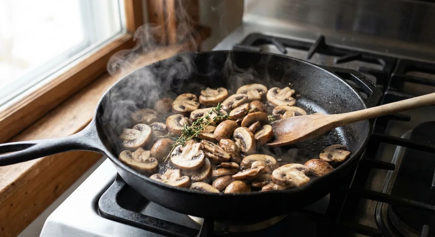 Dilimlenmiş mantarları tavaya ekleyin. Mantarlar suyunu salıp tekrar çekene kadar orta ateşte pişirmeye devam edin.