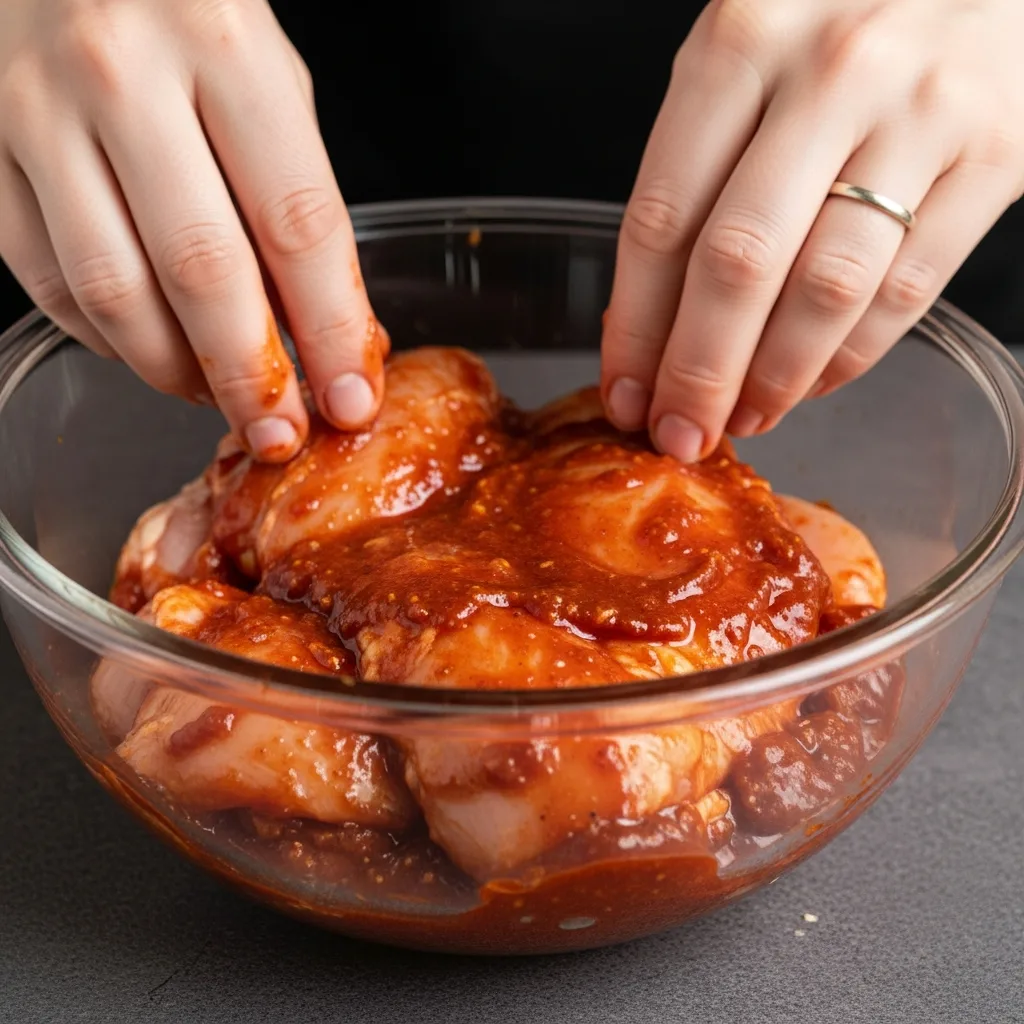 Tavuk göğüslerini hazırladığınız sosun içine ekleyin ve her yerinin sosla kaplandığından emin olun. Kabın üzerini streç film ile kapatıp buzdolabında en az 2 saat, tercihen bir gece dinlendirin.