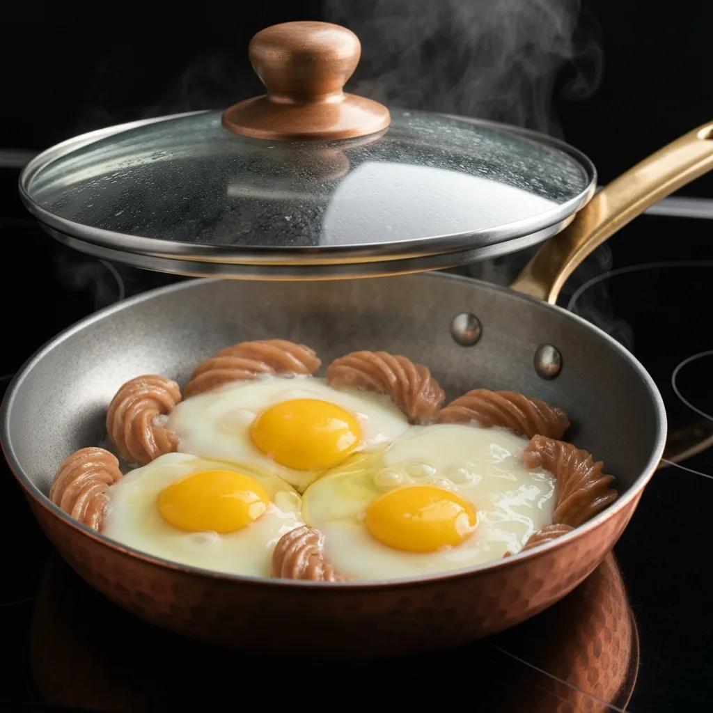 Tavanın kapağını kapatıp, yumurtaların beyazı tamamen pişene, sarısı ise istediğiniz kıvama (akışkan veya katı) gelene kadar kısık ateşte 2-3 dakika daha pişirin.