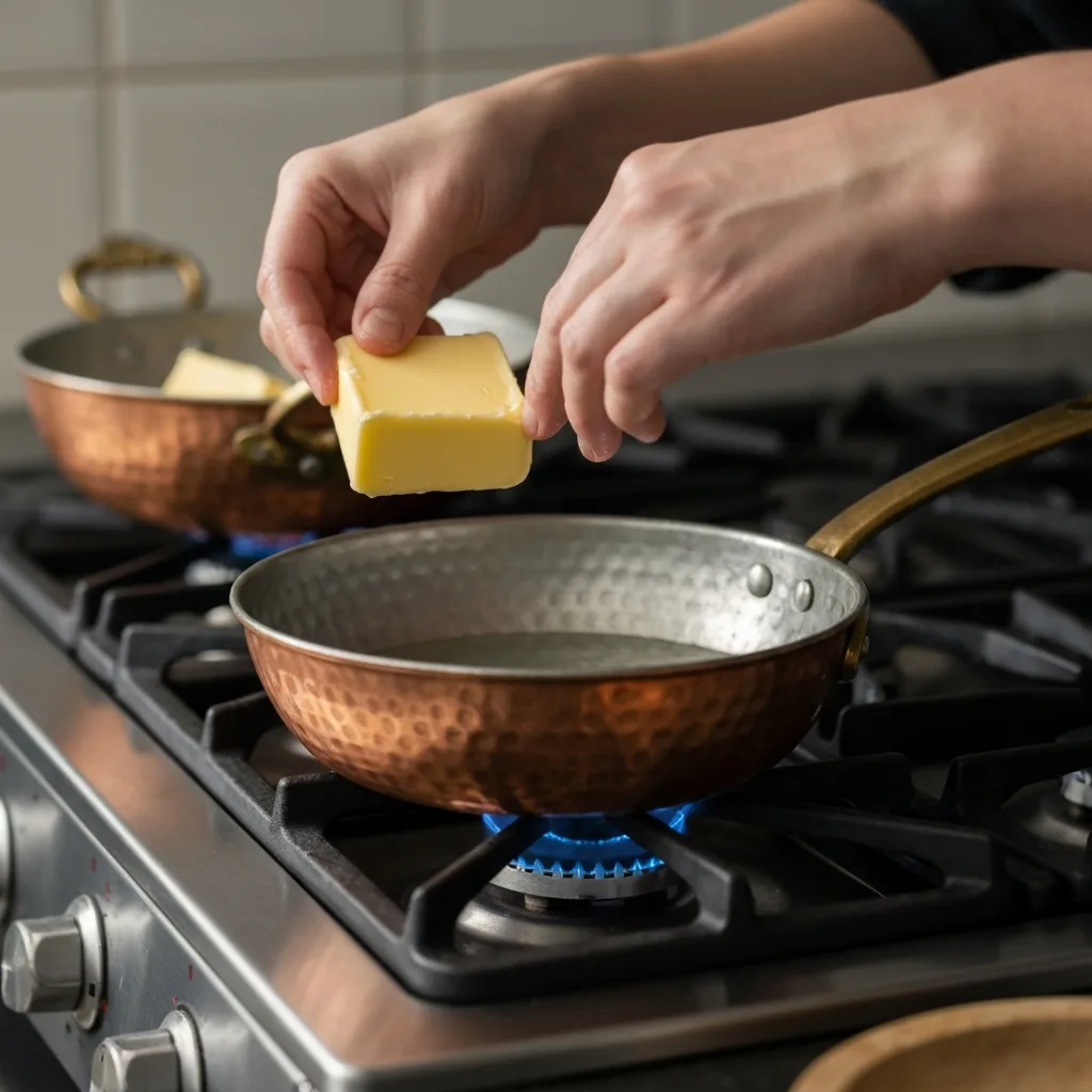 Bakır bir sahanı veya yapışmaz bir tavayı ocağa alın ve tereyağını orta ateşte eritin.