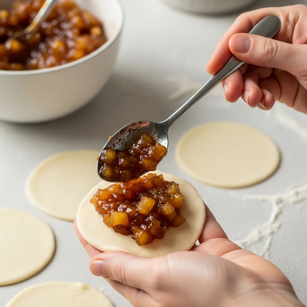 Hamurdan ceviz büyüklüğünde parçalar koparıp elinizde yuvarlayın ve avucunuzda hafifçe açın. Ortasına soğumuş elmalı harçtan 1 tatlı kaşığı kadar koyun ve hamuru kapatıp tekrar yuvarlayın veya oval şekil verin.