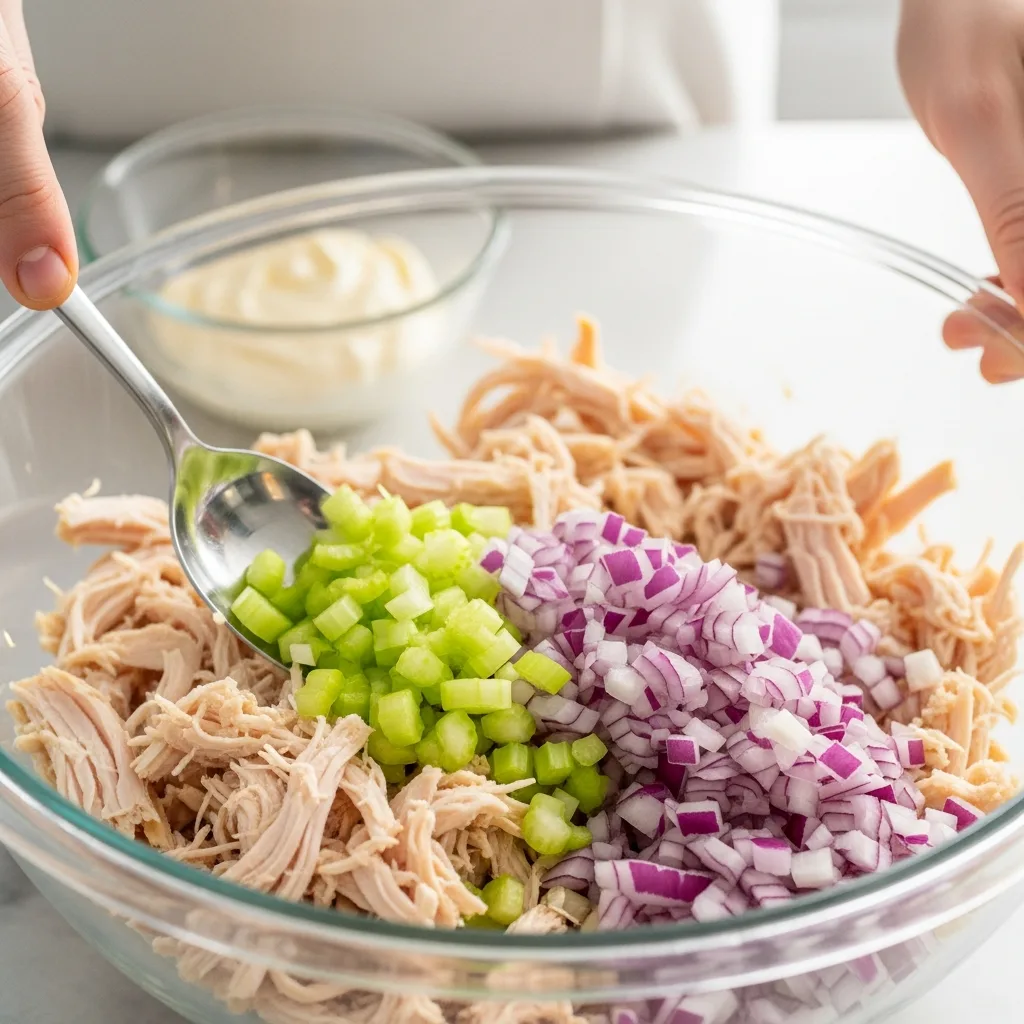 Geniş bir karıştırma kabında didiklenmiş tavukları, doğradığınız sebzeleri ve turşuyu bir araya getirin.