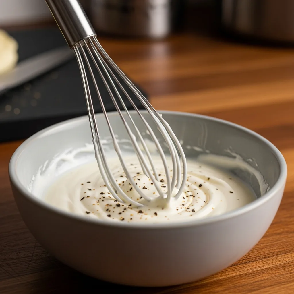 Ayrı bir kapta mayonez, süzme yoğurt, hardal, tuz ve karabiberi pürüzsüz bir kıvam alana kadar iyice çırpın.