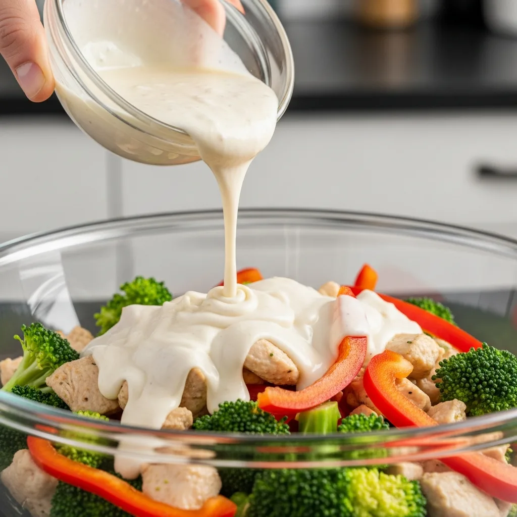 Hazırladığınız sosu tavuklu karışımın üzerine dökün ve tüm malzemelerin sosla kaplandığından emin olana kadar nazikçe karıştırın.