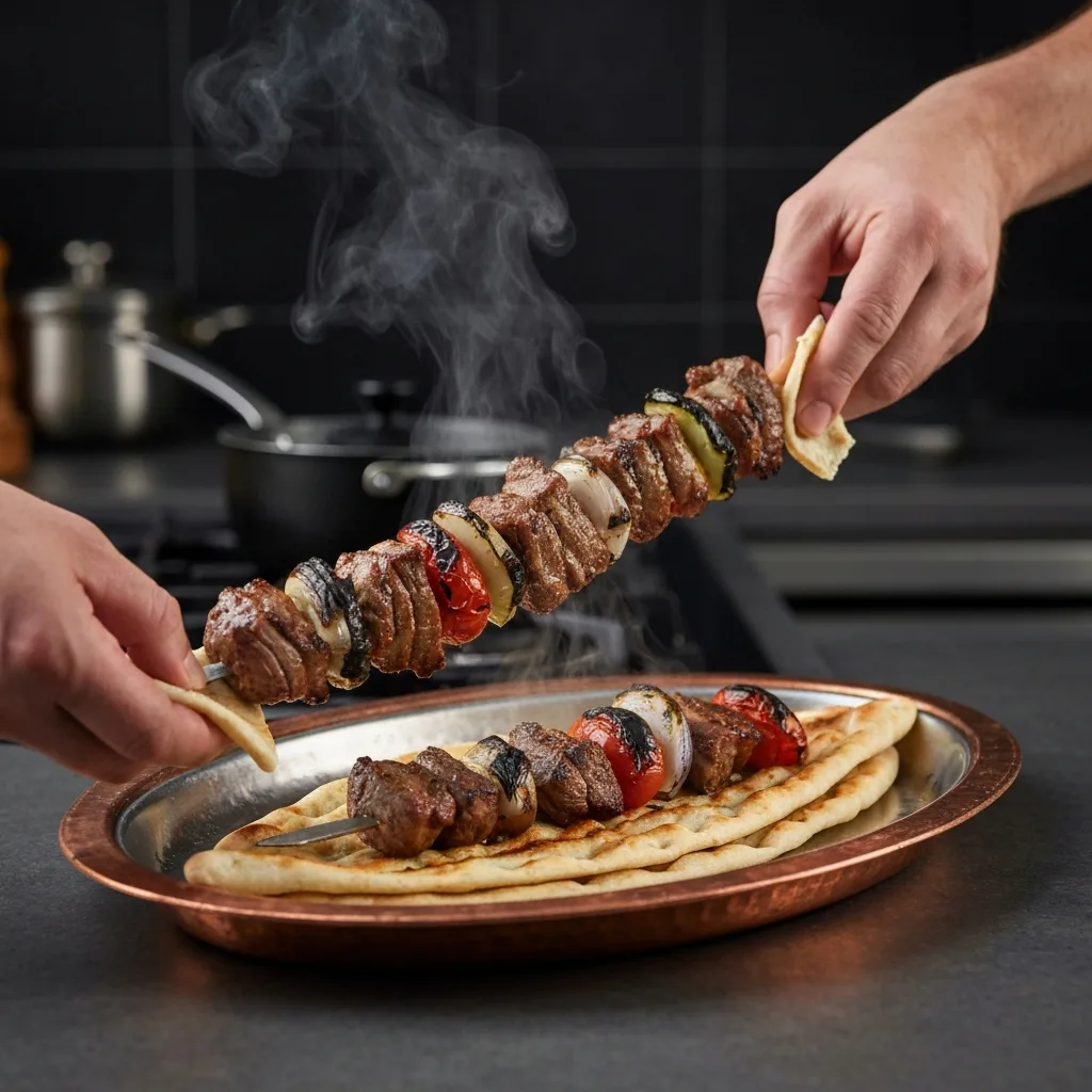 Servis tabağına önce soslu pideleri yayın, ardından şişleri pidenin üzerine sıyırarak kebabı yerleştirin ve sıcak olarak servis yapın.