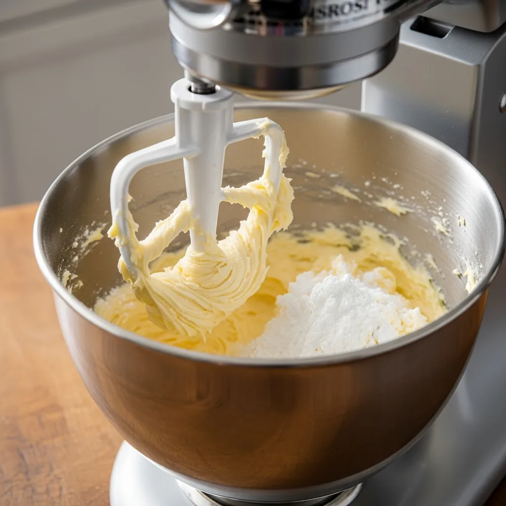 Geniş bir kapta oda sıcaklığındaki tereyağını ve pudra şekerini krema kıvamına gelene kadar mikserle çırpın.