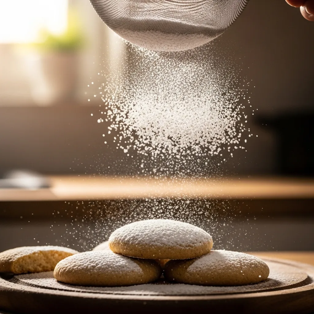Fırından çıkan sıcak kurabiyelerin üzerine bolca pudra şekeri serpin ve soğumaya bırakın.