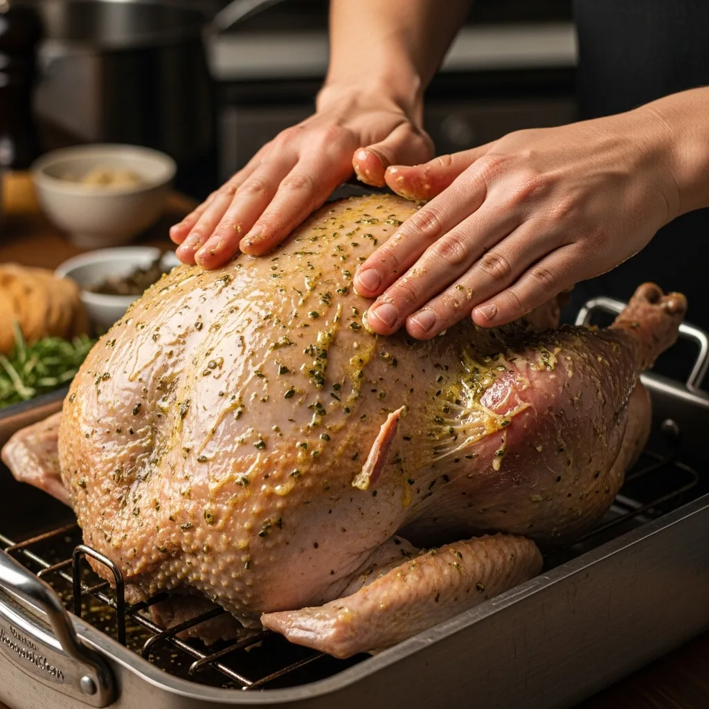 Hindiyi iyice yıkayıp kurulayın. Eritilmiş tereyağı, zeytinyağı, kırmızı toz biber, tuz ve karabiberi karıştırıp bir fırça yardımıyla hindinin her yerine sürün.