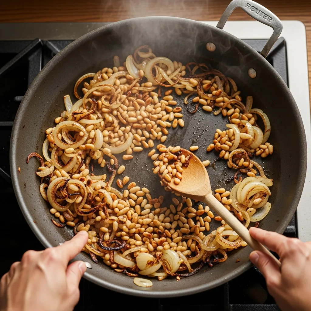 Öncelikle iç pilavı hazırlayın. Soğanları yemeklik doğrayıp zeytinyağında pembeleşinceye kadar kavurun. Dolmalık fıstıkları ekleyip rengi dönene kadar kavurmaya devam edin.