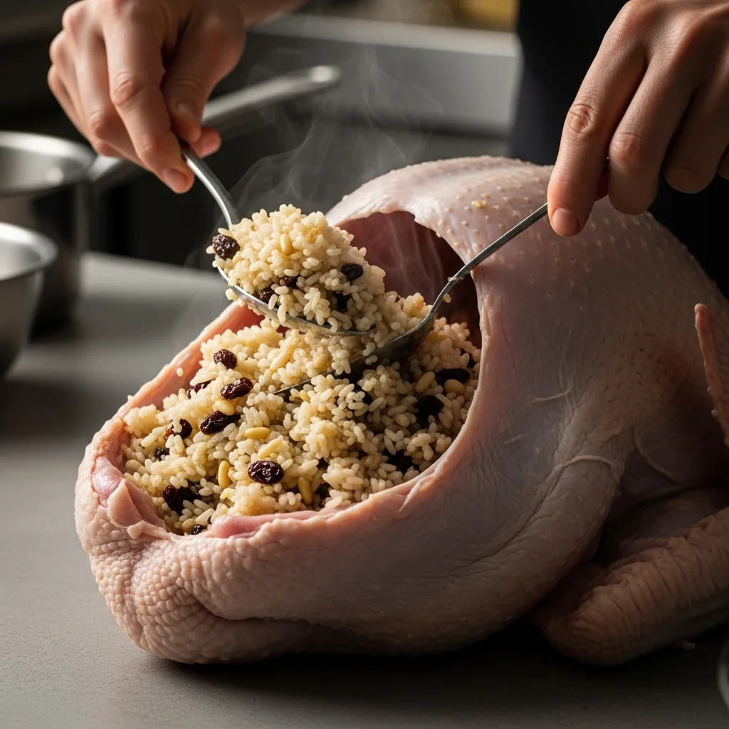 Hazırladığınız ve ılımış olan iç pilavı hindinin içine çok sıkıştırmadan doldurun. Açık kalan kısmı limon veya soğanla kapatabilir ya da mutfak ipiyle dikebilirsiniz.