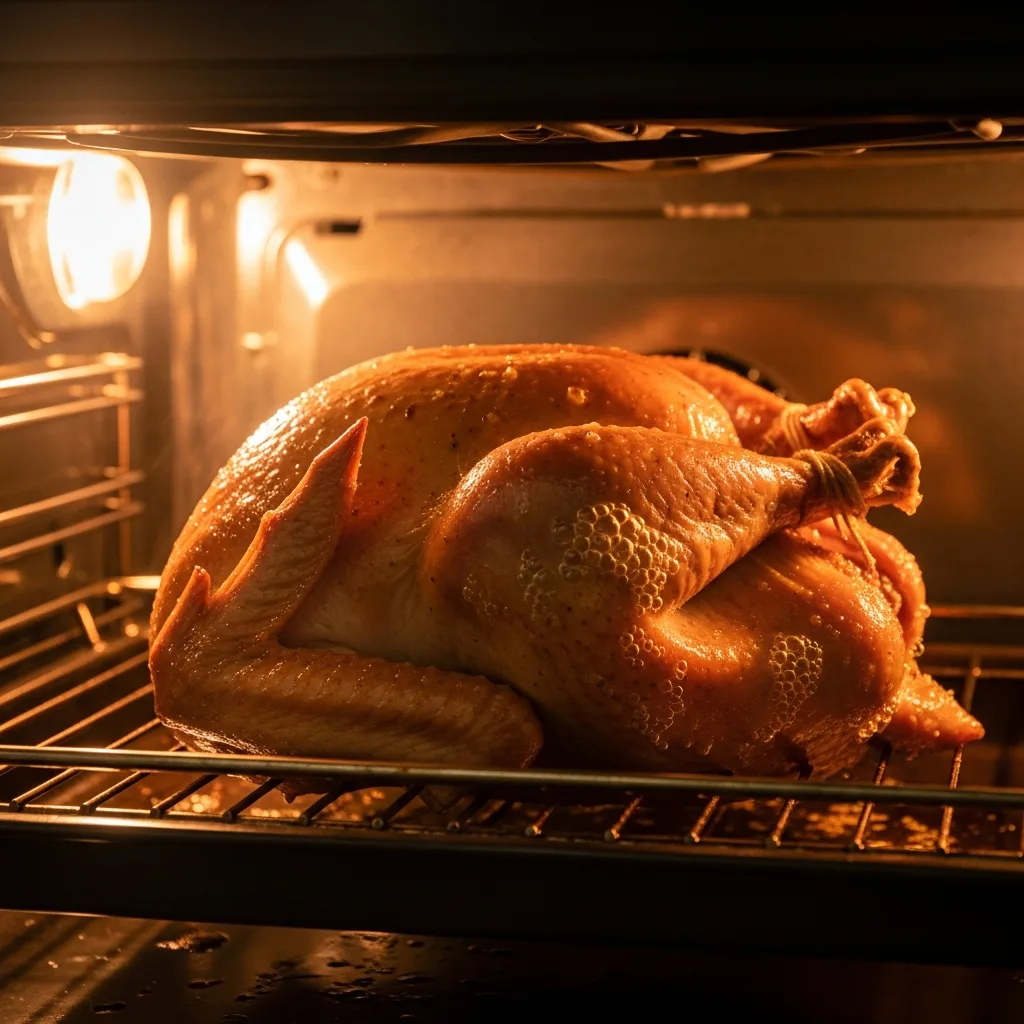 Önceden ısıtılmış 160°C fırında yaklaşık 3-3.5 saat pişirin. Bu sürenin sonunda folyo ve yağlı kağıdı kaldırıp, ısıyı 180°C'ye yükseltin. Üzeri nar gibi kızarana kadar yaklaşık 45 dakika - 1 saat daha pişirin. (Pişirme süresince 20 dakikada bir tepsideki sudan alıp hindinin üzerine gezdirin.)