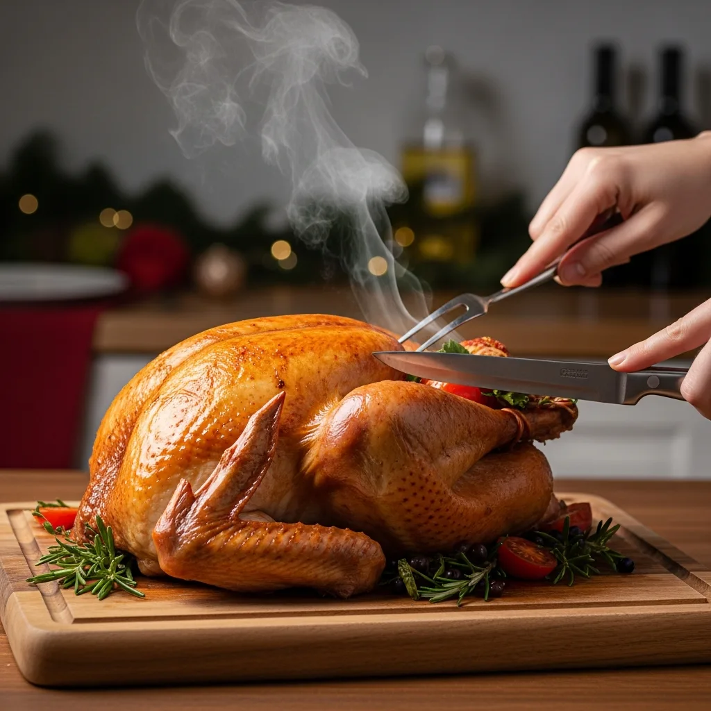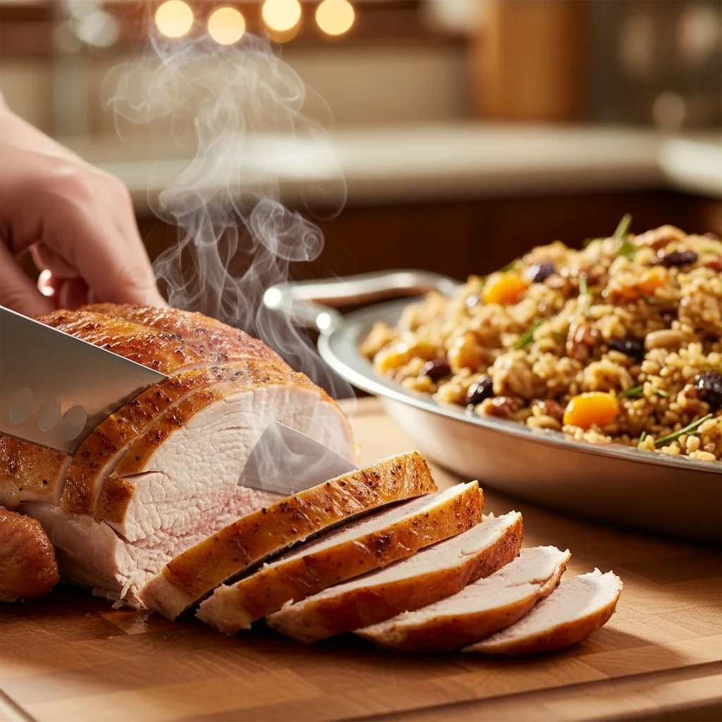 Fırından çıkan hindiyi servis etmeden önce mutlaka 20-30 dakika dinlendirin. Dilimleyerek iç pilavı ile birlikte sıcak servis yapın.