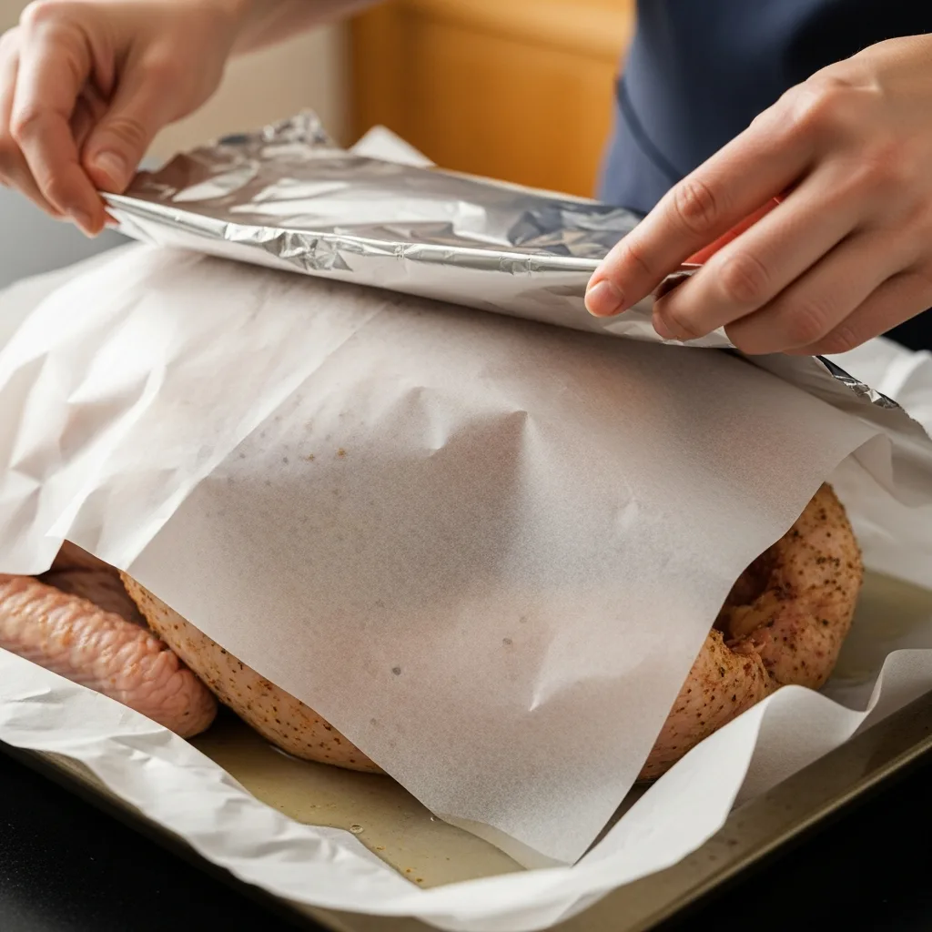 Tepsiye yaklaşık 1 su bardağı su ekleyin. Hindinin üzerini önce yağlı kağıt, sonra alüminyum folyo ile sıkıca kapatın.