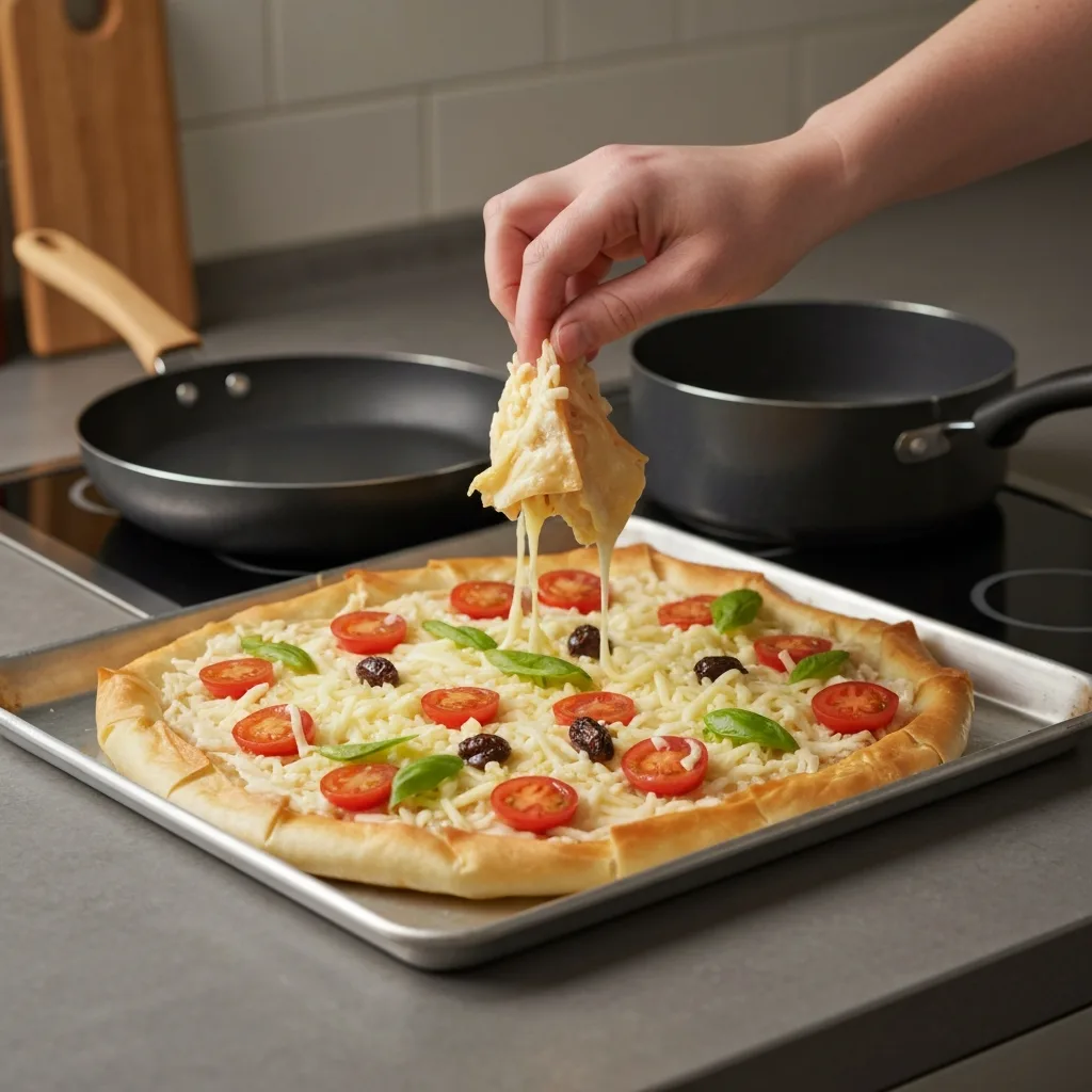 İkinci yufkayı buruşturarak tepsinin içine yerleştirin ve kalan sosu üzerine gezdirin. Kenarlardan sarkan yufkayı içeri doğru katlayın.
