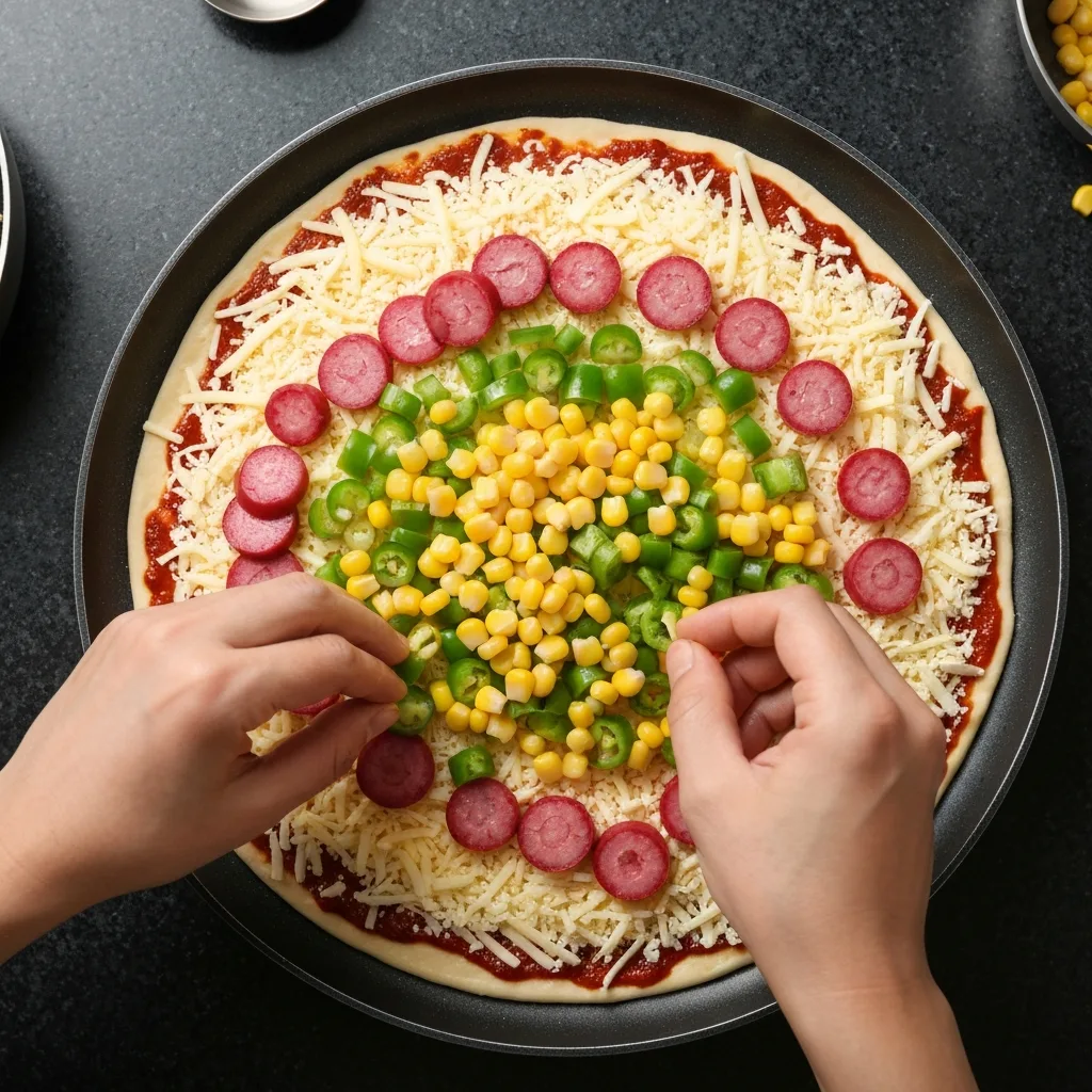 Önce rendelenmiş kaşar peynirinin bir kısmını serpin, ardından dilediğiniz malzemeleri (sucuk, biber, mısır vb.) dizin.
