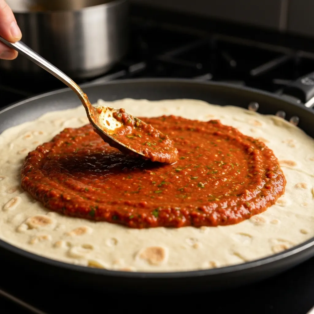 Domates salçası, zeytinyağı ve baharatları karıştırarak pizza sosunu hazırlayın ve yufka tabanının üzerine yayın.